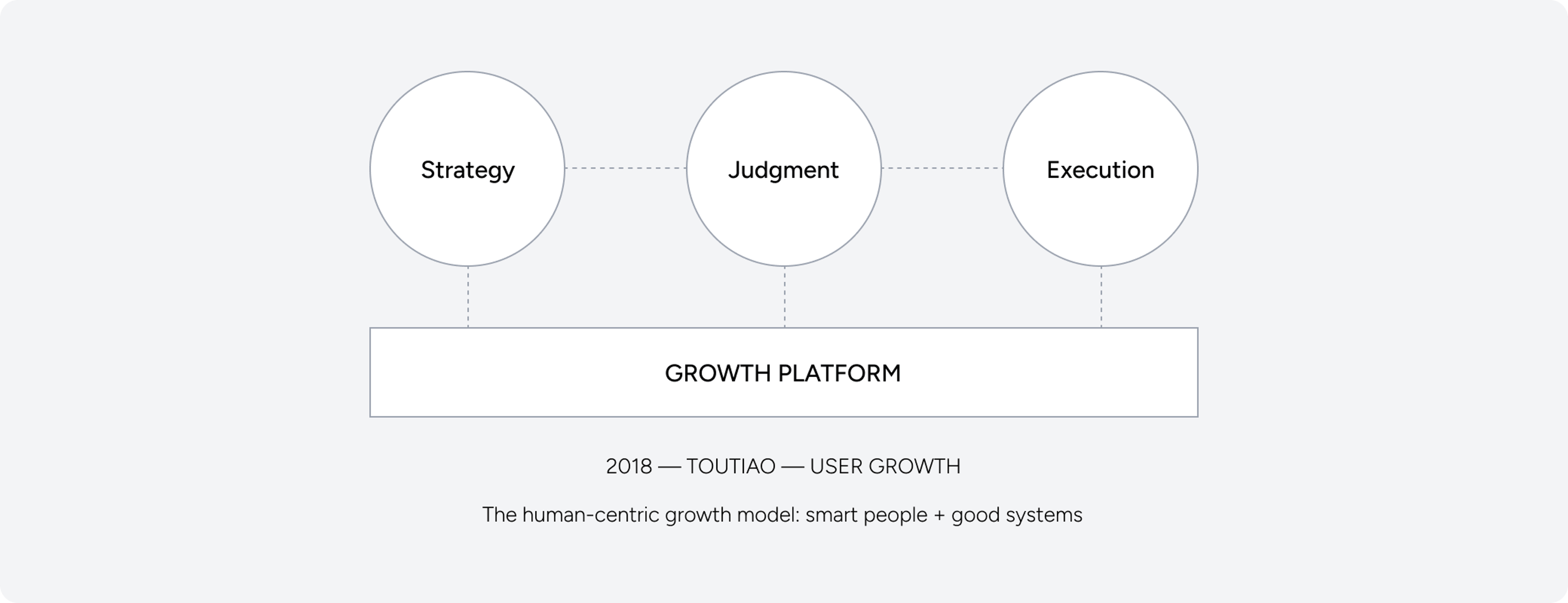 First, building a centralized growth platform — abstracting the scattered capabilities of ad buying, creative production, push notifications, and referral loops into reusable, platform-level tools and playbooks. Second, acting as growth Business Partners: embedding into Toutiao, Xigua, Huoshan, and TikTok to deploy those tools, then feeding validated learnings back into the platform.
