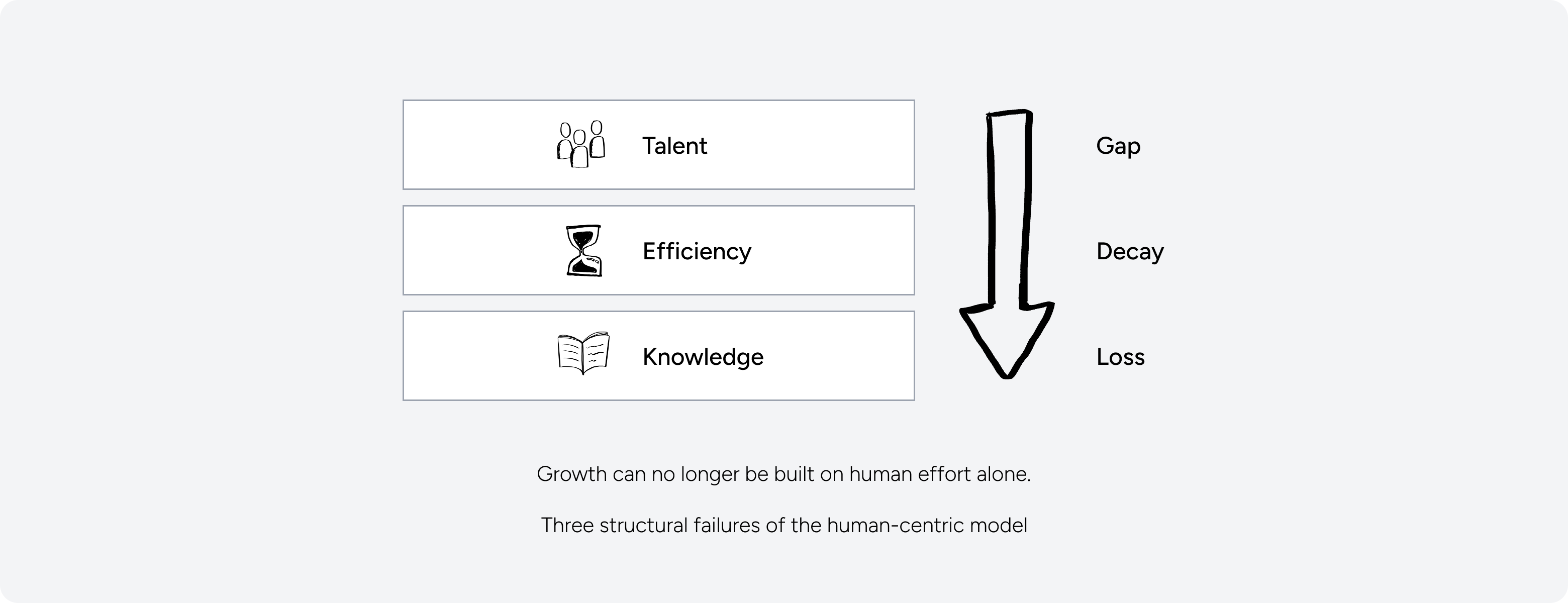 This isn't a management failure at any particular company. It's a structural flaw in the operating model itself. As long as expertise is stored in individual brains, it can never be truly inherited, reused, or compounded.