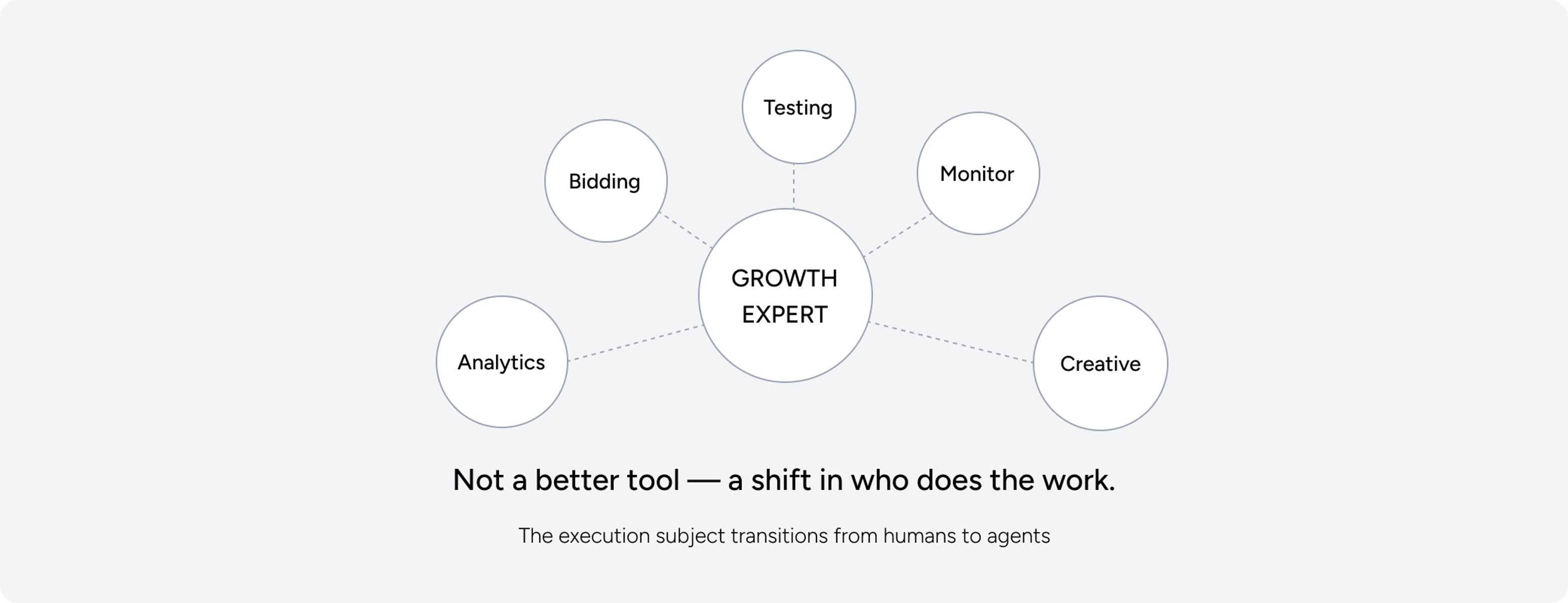 Growth is just the entry point. Tens of millions of people worldwide work in digital marketing and growth. A disproportionate share of their time goes to checking dashboards, adjusting bids, swapping creatives, and monitoring for anomalies. Many of these people are talented, well-educated, and creative — yet their intelligence and imagination have been trapped at the execution layer for years. That's an enormous waste of human potential.